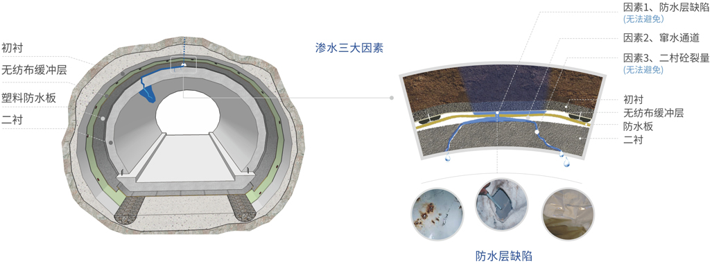 傳統(tǒng)的礦山法隧道基本上以塑料板(EVA、PVC、ECB等)為主體材料進行防水設(shè)防,在國內(nèi)現(xiàn)有的施工條件和組織形式下,滲漏很普遍,嚴重影響行車安全和結(jié)構(gòu)壽命,給后期維護帶來沉重的負擔(dān)。